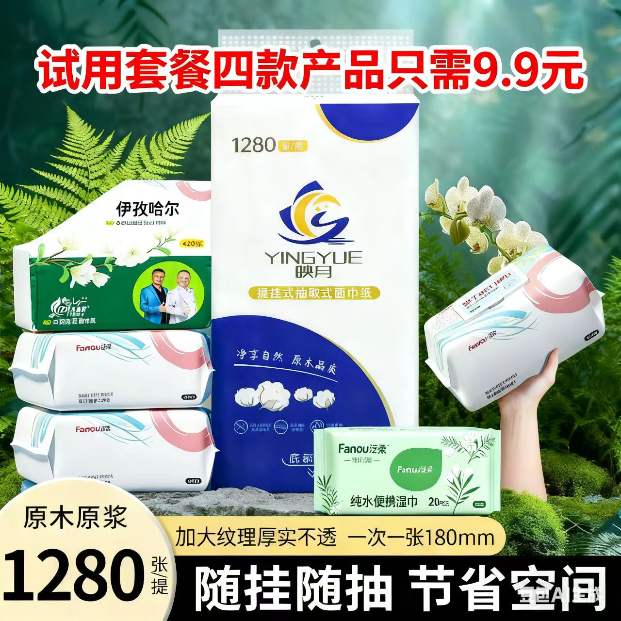 1包泛柔大湿纸巾货号FR2101-80 1包泛柔绿色便携湿巾货号FR25220 1包伊孜哈尔抽纸货号YZHR-2181 1包映月蓝色小底部抽货号9990