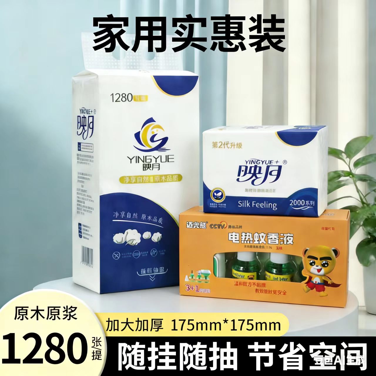4提悬挂式底部抽纸价值40元,2提9747型号刀切纸价值20元,1盒电热蚊香液价值40元
